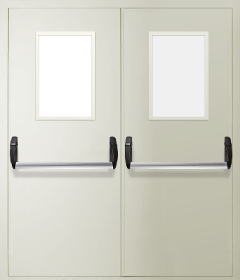 - Противопожарные двери со стеклом изготовлены из нержавеющей стали и оснащены сертифицированной фурнитурой. Производитель укомплектовал эти двери универсальными ручками «push-bar» с креплением горизонтального типа. Данная фурнитура подходит для дверей с любым количеством створок. Чтобы открыть полотно изнутри достаточно опустить ручку-штангу вниз.