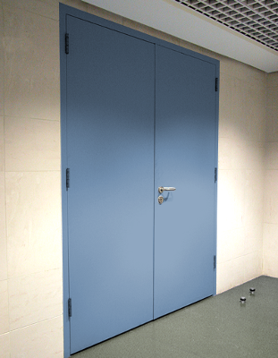 - Глухие двупольные огнестойкие двери состоят из коробки, двух полотен, внутренних наполнителей, деталей фурнитуры. Размеры зависят от места монтажа. Чаще всего их устанавливают на запасном эвакуационном входе, лестничной клетке, лифте, тамбуре. Поэтому конструкция имеет нестандартные параметры.